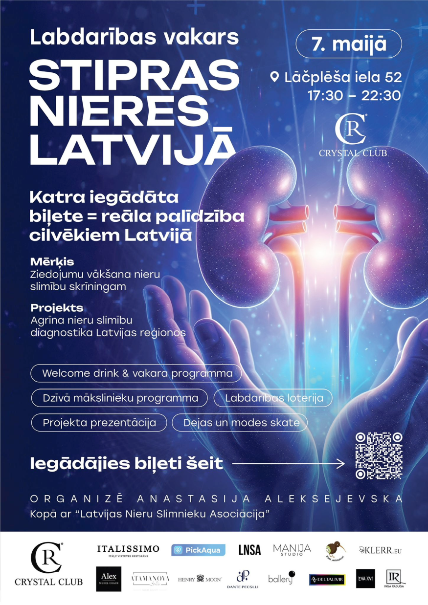 7 мая в Риге состоится благотворительный вечер «Сильные почки в Латвии», цель которого — сбор средств для пилотного проекта Ассоциации пациентов с заболеваниями почек Латвии. Организатором выступает Анастасия Алексеевская, главный спонсор — Crystal Club. Мероприятие пройдет с 17:30 до 22:30.
