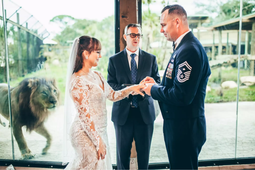 Тара, координатор мероприятий в зоопарке «Бревард», решила сделать свадьбу по-настоящему запоминающейся и выбрала необычное место для росписи — новую зону с вольером для львов. «Это было очень круто. Моя жена — координатор мероприятий в зоопарке, и они только что завершили строительство этой зоны», — рассказал жених.