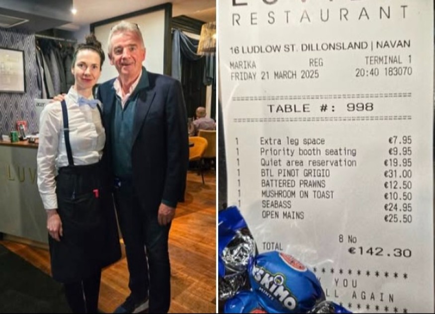 Посетив ресторан Luvida в ирландской деревушке Наван, О’Лири заказал вполне скромный ужин: сибас, тост с грибами, креветки в кляре и бутылочку пино гриджо — потому что кто мы такие без пино гриджо? Всё шло как по маслу, пока не принесли счёт.