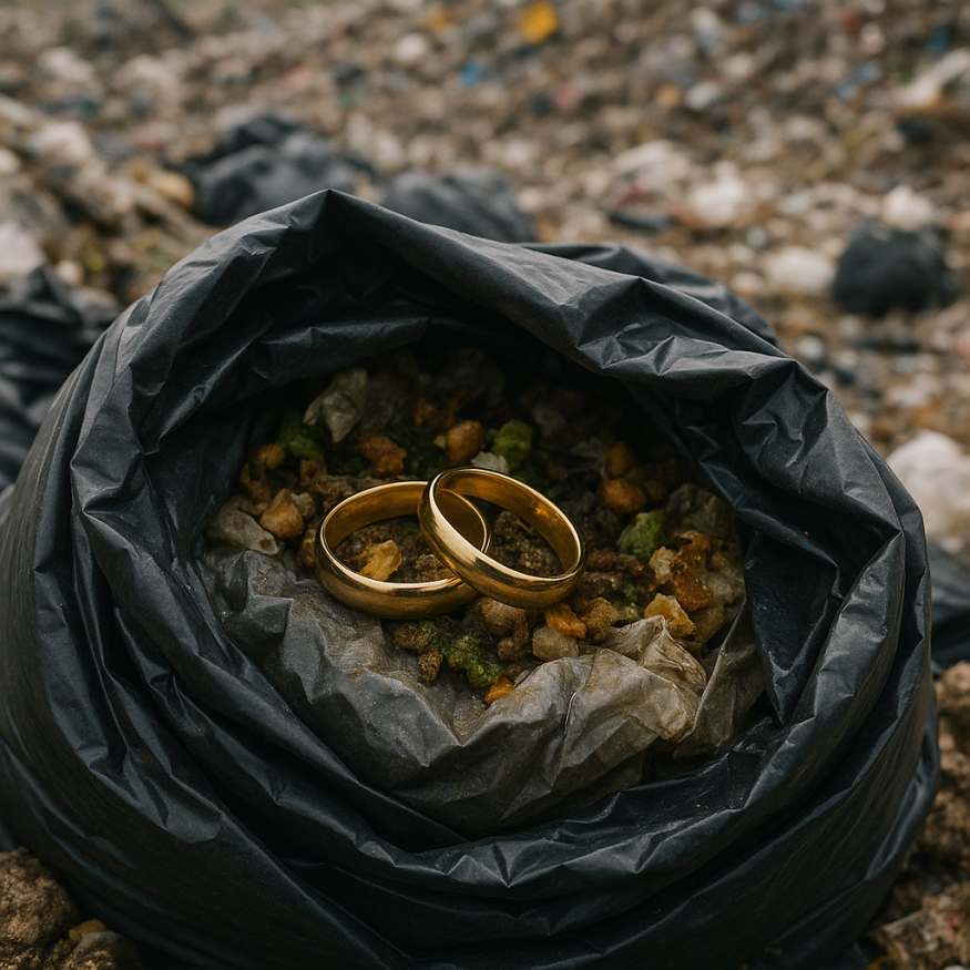 История началась с того, что его жена Джанин случайно выбросила обручальные кольца — символ 26 лет брака. Украшения оказались в пакете с попкорном и уехали вместе с мусоровозом на свалку.