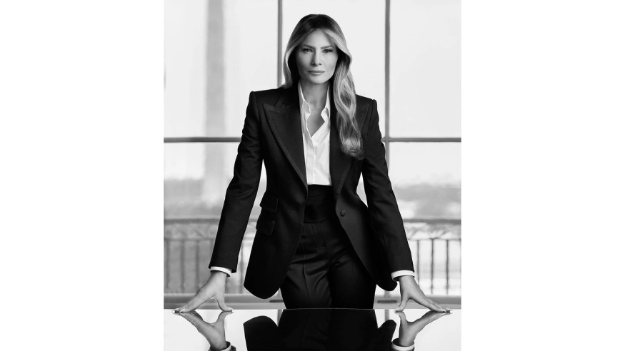 Для портрета Мелания выбрала элегантный черный костюм и белую рубашку. По информации Breitbart News, стоимость её наряда превышает 4 тысячи долларов: пиджак от Dolce & Gabbana оценивается в 3 тысячи долларов, а брюки — около тысячи.