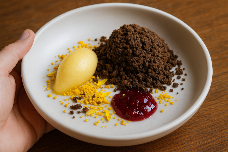 В состав необычного десерта входят: собственно переработанный навоз в виде хрустящих крошек, фруктовый джем, пыльца и медовый сорбет.