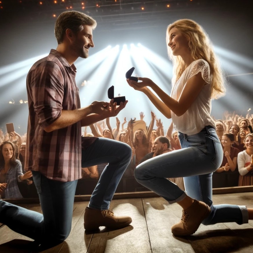 На концерт пара приехала с друзьями и родственниками. Первой на колено опустилась Рейчел. Рашад в ответ засмеялся и тоже опустился на колено рядом с девушкой, держа в руке кольцо для нее. Эту сцену засняла дочь Рейчел, Жасмин, — она единственная знала, что влюбленные собираются сделать предложение друг другу в один момент, но сохранила это в тайне.